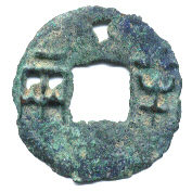 3 - Monnaie daquan wushi 大泉五十. Wang Mang, émission de 7 à 14 ap. J.-C. Bronze, Ø 28 mm, 5,30g; la coulée de métal n'est pas parvenue à faire le tour du carré qui ménageait le trou. |